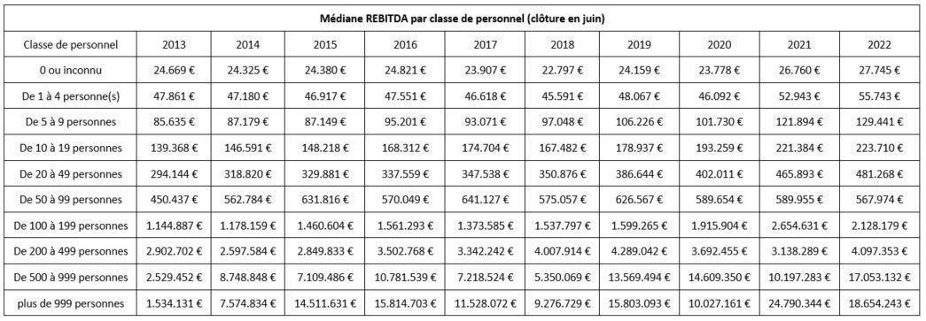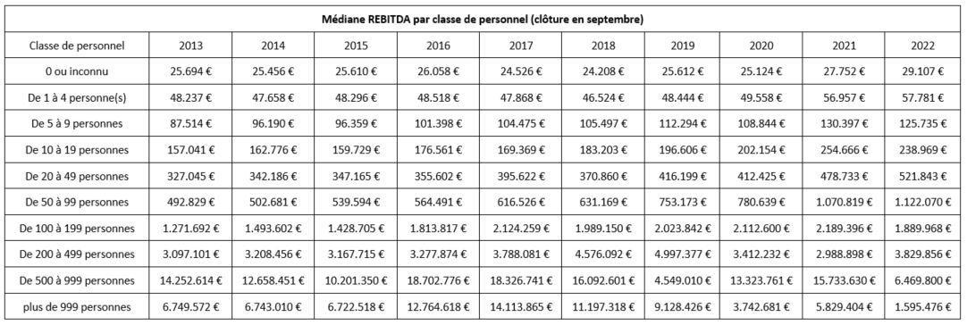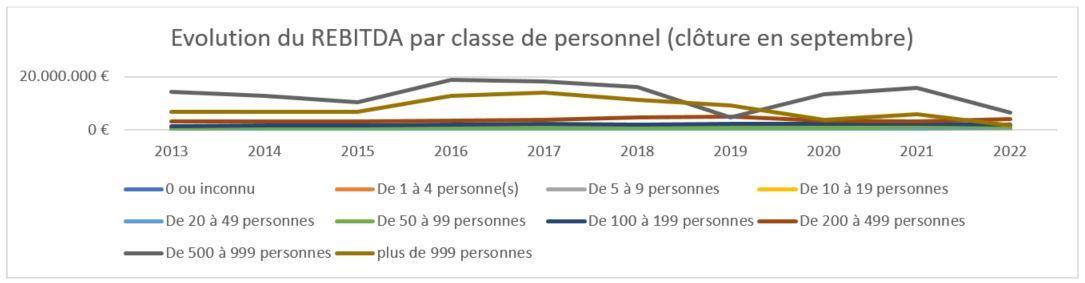 L’exercice 2022 a amené une forte correction de leur REBITDA. Vu que ces entreprises sont les « gros moteurs » de notre économie, c’est un point d’attention inquiétant. Pour les entreprise de 1 à 20 personnes, la progression de 2021 s’est plutôt confirmée en 2022 (ou est en très légère correction). Les PME de 20 à 50 personnes arrivent, elles, à confirmer une progression en 2022 par rapport à la belle année 2021. Pour les entreprises de 50 à 99 personnes qui clôturent en septembre, l’exercice 2021 – 2022 est en progression intéressante, tout comme les entreprises de 200 à 499 personnes, sans toutefois revenir aux niveaux de 2018 et 2019.