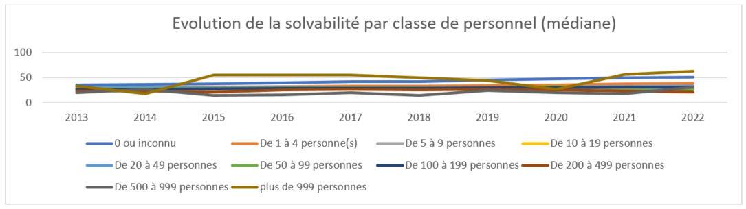 Les employeurs ont globalement plus de mal que les autres, et plus l’emploi est important, plus la solvabilité souffre en 2022. Curieusement, les entreprises sans emploi ont la médiane la plus solide. Elle franchit la valeur des 50% en 2022.