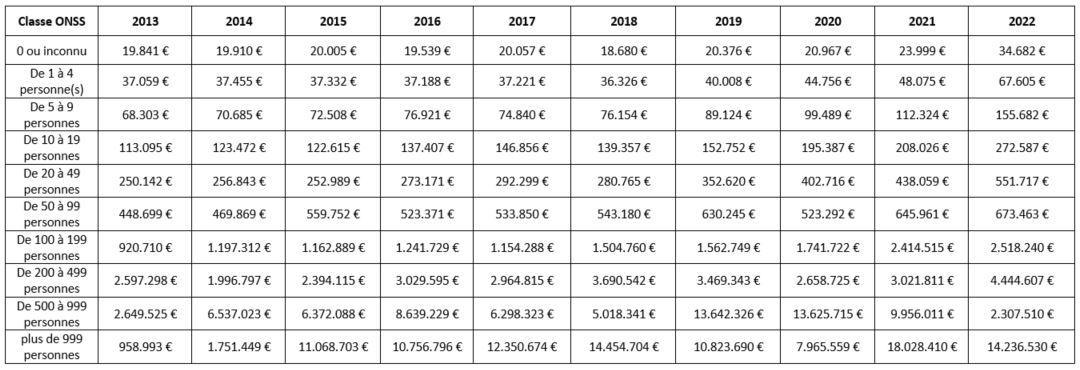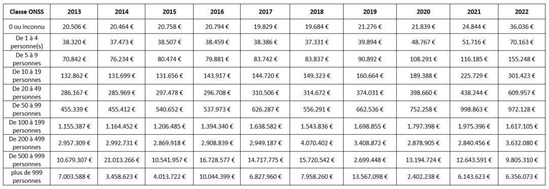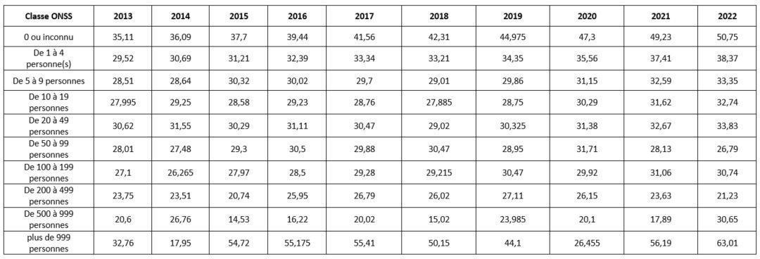 Le nombre d’entreprises étant assez restreint, il est un peu aventureux de tirer des conclusions définitives. Pour les catégories élevées, la volatilité semble importante. Mais le petit nombre d’entreprises par catégorie au-delà de 100 personnes rend l’interprétation aléatoire. Il n’empêche que les entreprises des deux plus grosses catégories ont une forte tendance globale à la baisse. Même la bonne année 2021 ne les ramène pas aux bons niveaux de 2016 à 2018.