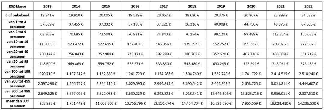Bij de categorieën met een groter personeelsbestand lijkt de volatiliteit groot. Gezien het kleine aantal ondernemingen per categorie zodra het personeelsbestand meer dan 100 personen telt, wordt interpreteren echter eerder gissen. Dat neemt niet weg dat de ondernemingen uit de twee categorieën met het grootste personeelsbestand een sterke algemeen dalende trend vertonen. Zelfs in het goede jaar 2021 halen ze niet meer de mooie niveaus van 2016 tot 2018.
